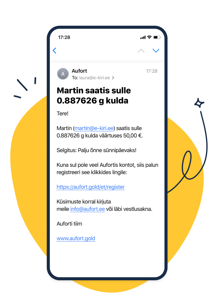 | Saaja saab kulla koheselt kätte. Kui tal pole Auforti kullakontot, saab ta juhised selle registreerimiseks. | ![]() ![]() |